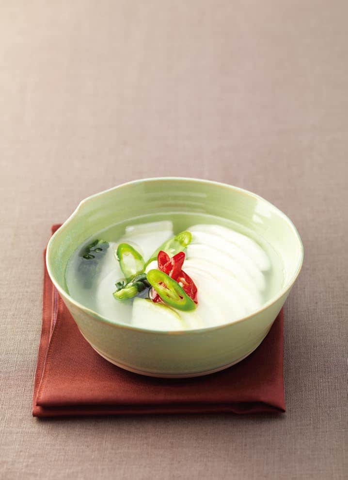 It is a type of watery kimchi made by salting radish and then adding fermented chili pepper and chives, and soaking in salted water. It has a characteristically refreshing taste, and the well fermented liquid portion of the dongchimi is used as a soup broth for mulnaengmyeon (cold buckwheat noodle soup) by mixing it with a meat broth.